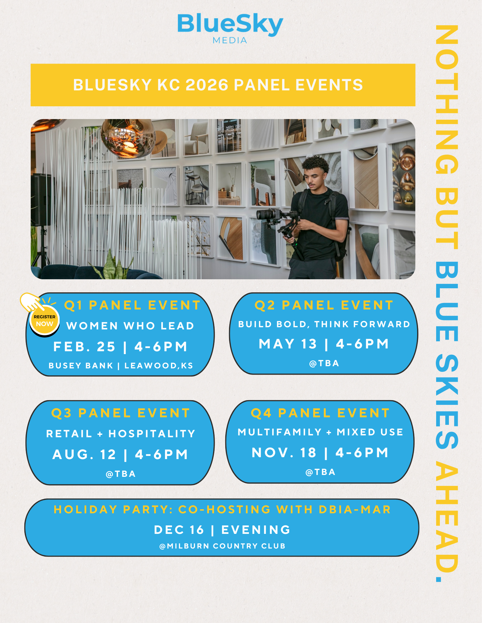 At BlueSky Media, our events are where meaningful connections and big ideas come to life. In 2026, we will host four quarterly panel events in KC and St. Louis featuring leading voices across each city’s AEC and CRE industries, complemented by monthly happy hours and pop-up gatherings aligned with our editorial content themes. (Request our 2026 Media Kit to view the full lineup of monthly themes.)